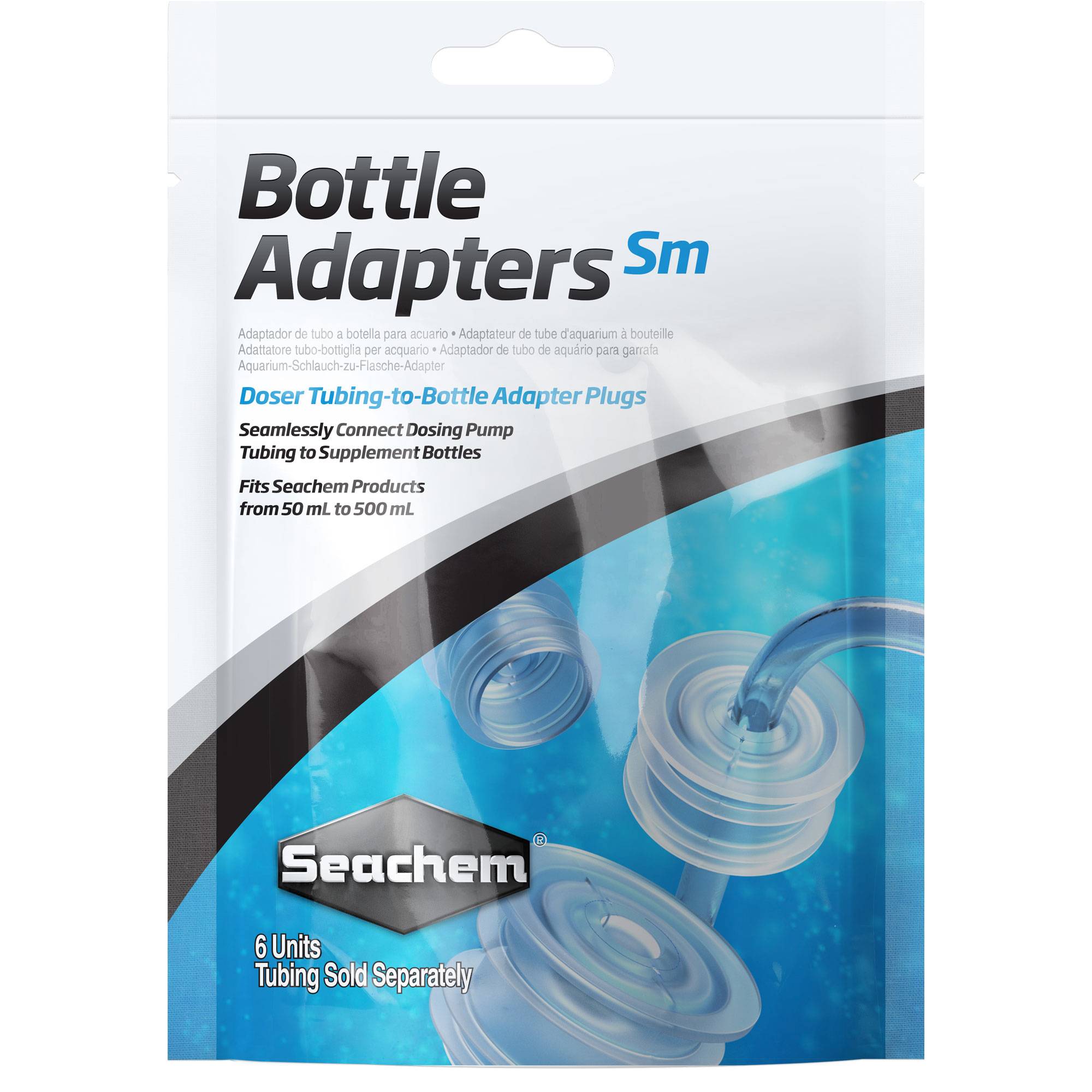 Adaptateur qui s’insèrent dans les bouteilles de produit Seachem de 50mL à 500mL (Ø24mm) et qui permet de relier la bouteille directement à une pompe doseuse via un tuyau 4/6. Facilitent le dosage précis sans renversement.